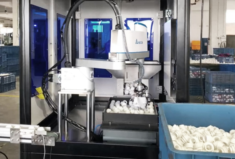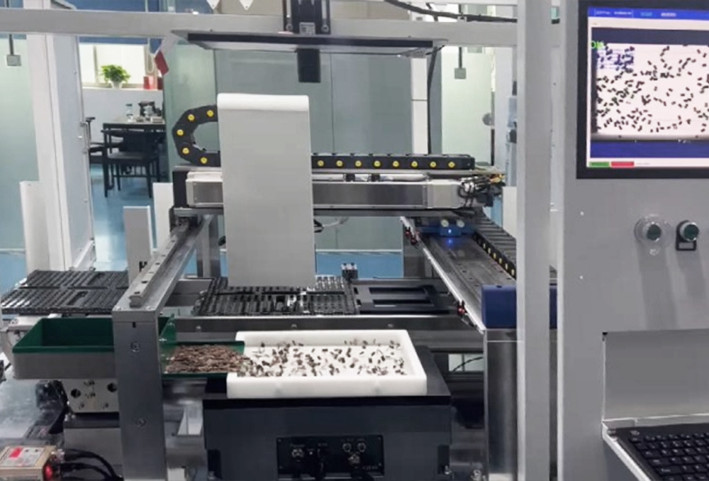 柔性上料系統(tǒng)是依托智能CCD相機(jī)對(duì)產(chǎn)品進(jìn)行定位識(shí)別,視覺(jué)軟件系統(tǒng)發(fā)送產(chǎn)品相應(yīng)坐標(biāo)給機(jī)器人,機(jī)器人依據(jù)視覺(jué)坐標(biāo)進(jìn)行產(chǎn)品抓取。產(chǎn)品定位依托視覺(jué)系統(tǒng),無(wú)需產(chǎn)品定位,可實(shí)現(xiàn)柔性生產(chǎn)、自主補(bǔ)料和快速切換,解決企業(yè)中小訂單產(chǎn)品自動(dòng)化難題
